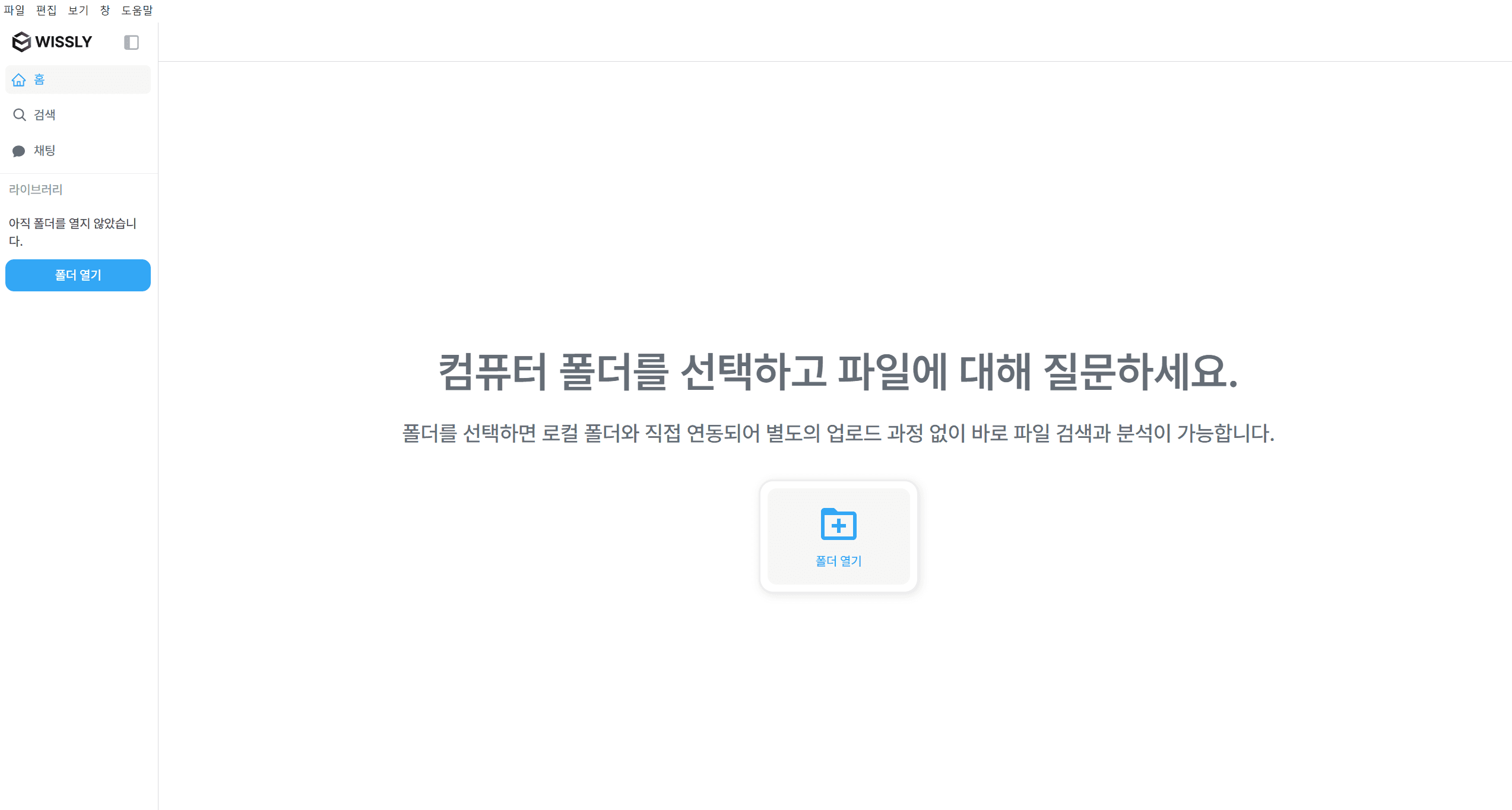 Wissly는 특정 문서를 ‘업로드’하는 방식이 아니라, 문서가 모여있는 최상위 ‘폴더를 연동’하는 방식입니다. 그래서 다수의 문서를 한 번에 연동할 때 편합니다.