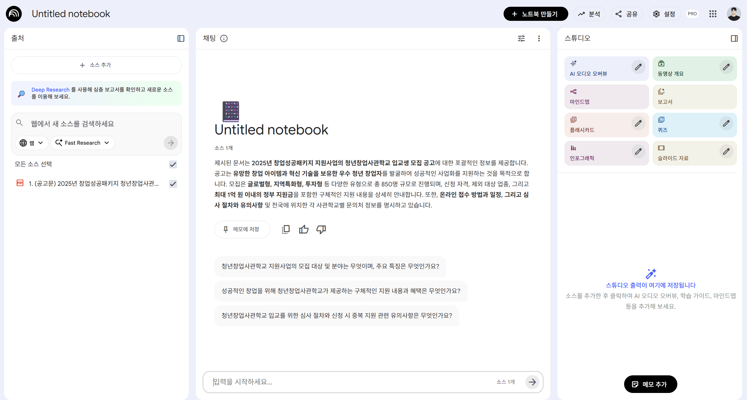 특정 문서를 업로드하면 실시간으로 요약이 진행되며 질문 리스트를 자동으로 생성합니다. 또한 스튜디오에서 다양한 에이전트를 활용하여 문서를 디테일하게 분석할 수 있습니다.