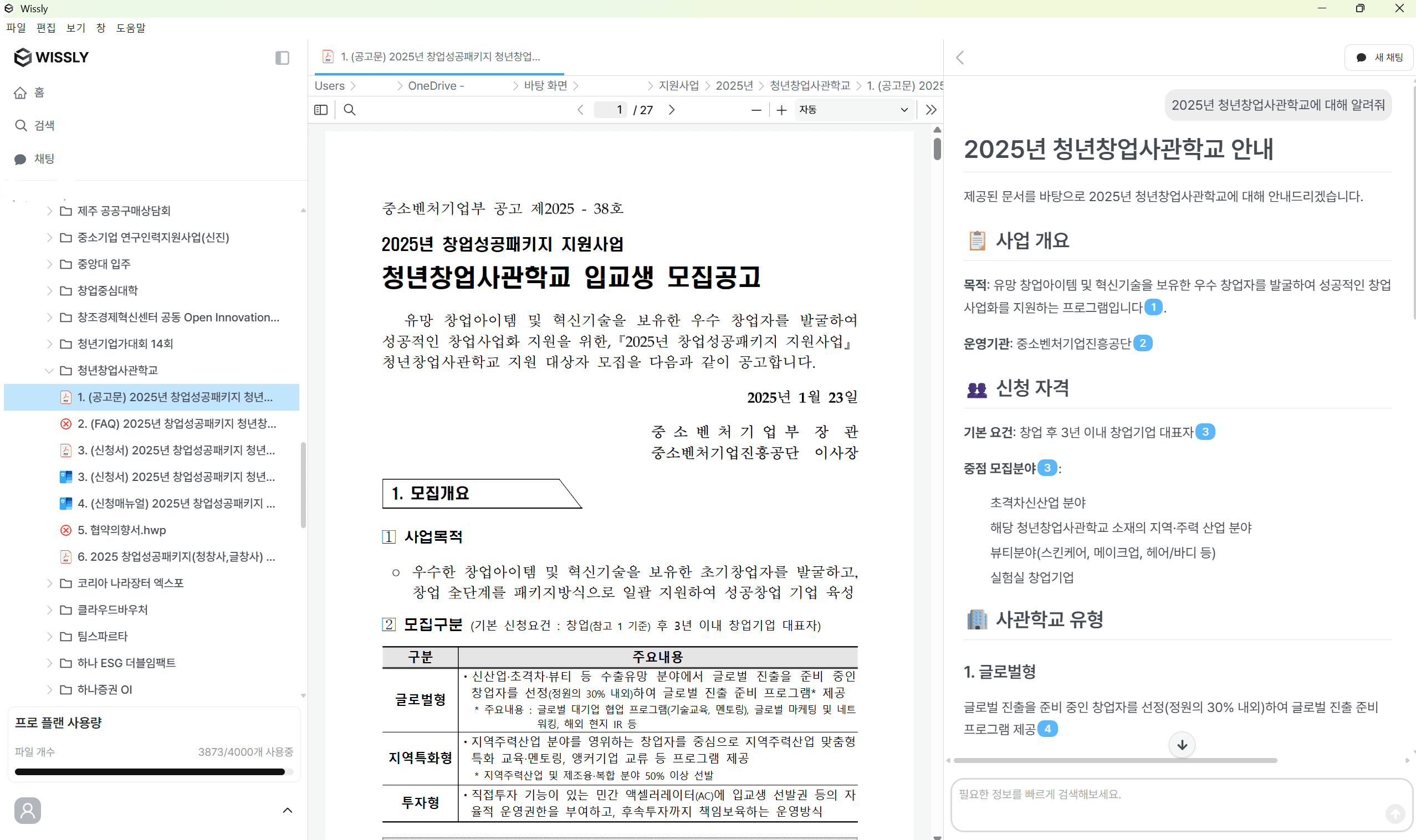 Wissly는 폴더구조와 폴더 내 모든 문서를 실시간 연동해주기에 별도로 특정 문서를 업로드할 필요가 없습니다. 그래서 문서 내용에 대해 궁금한 부분을 질문하면 해당 문서를 찾아서 중앙에 뷰어로 보여주고 오른쪽에 답변을 제공합니다. 특정 문서만 분석하고자 하는 니즈보다는 많은 문서 속에서 특정 정보만 탐색 및 요약하고 싶을 때 활용하기 좋습니다.