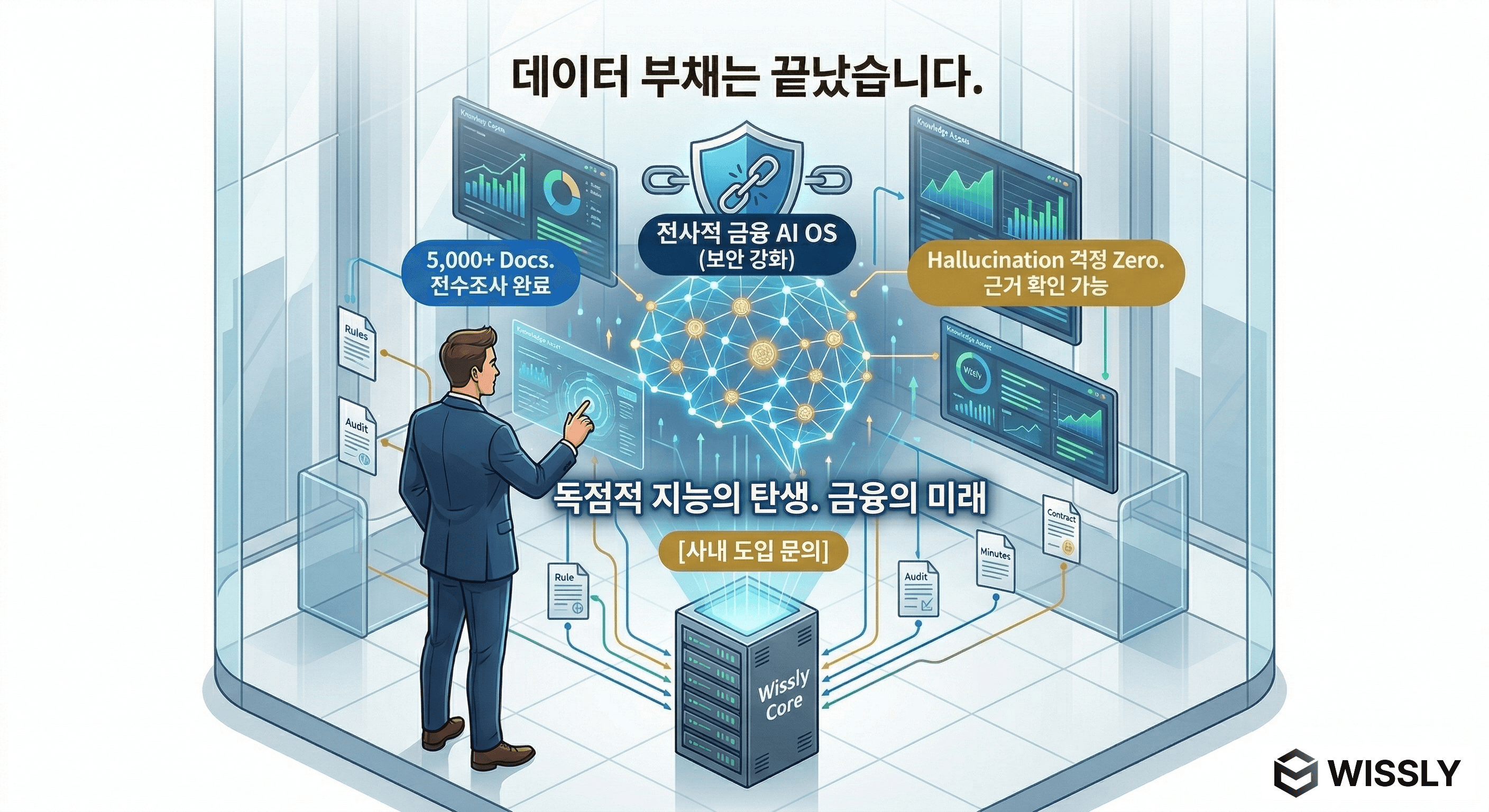 진정한 혁신은 개별 업무의 속도를 높이는 것을 넘어, 조직 전체가 하나의 거대한 지능형 유기체(Single Intelligent Organism)처럼 움직일 때 일어납니다. 오늘 시리즈의 마지막인 3편에서는 파편화된 사내 데이터를 어떻게 기업의 '독점적 지식 자산'으로 전환하고, 위슬리(Wissly)의 금융 AI 에이전트 기술을 통해 완벽한 의사결정 체계를 구축하는 법을 공개합니다.