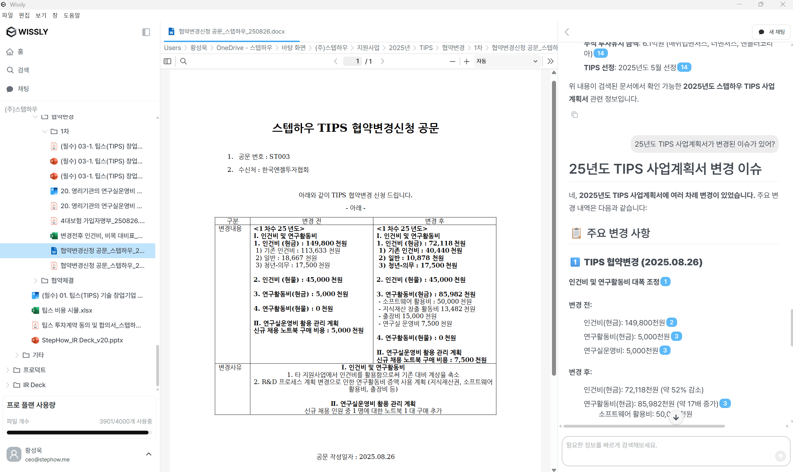Wissly는 파일 제목으로 문서를 탐색하는 것이 아니라 자연어 기반으로 검색할 수 있습니다. 그래서 문서의 본문 내용으로도 쉽게 검색이 가능했고 문맥과 맥락을 이해하며 AI가 문서에 대해 답변할 수 있었습니다.