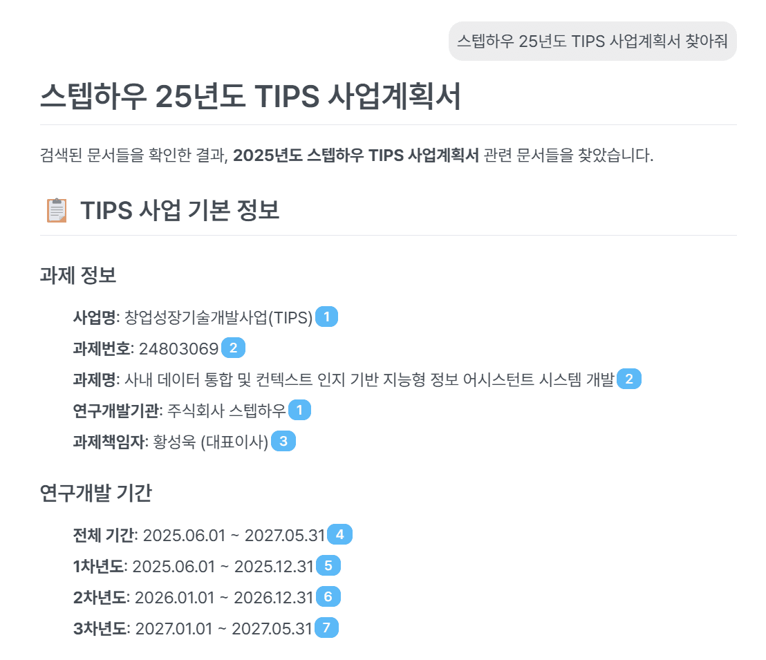 자연어 기반으로 문서 내용을 질문하면 해당 문서를 바로 열람해주고 해당 문서가 저장된 폴더 경로를 실시간으로 보여줍니다. 그래서 문서를 직접 찾을 수 있는 경로도 알게되어 문서 탐색이 효율적입니다.