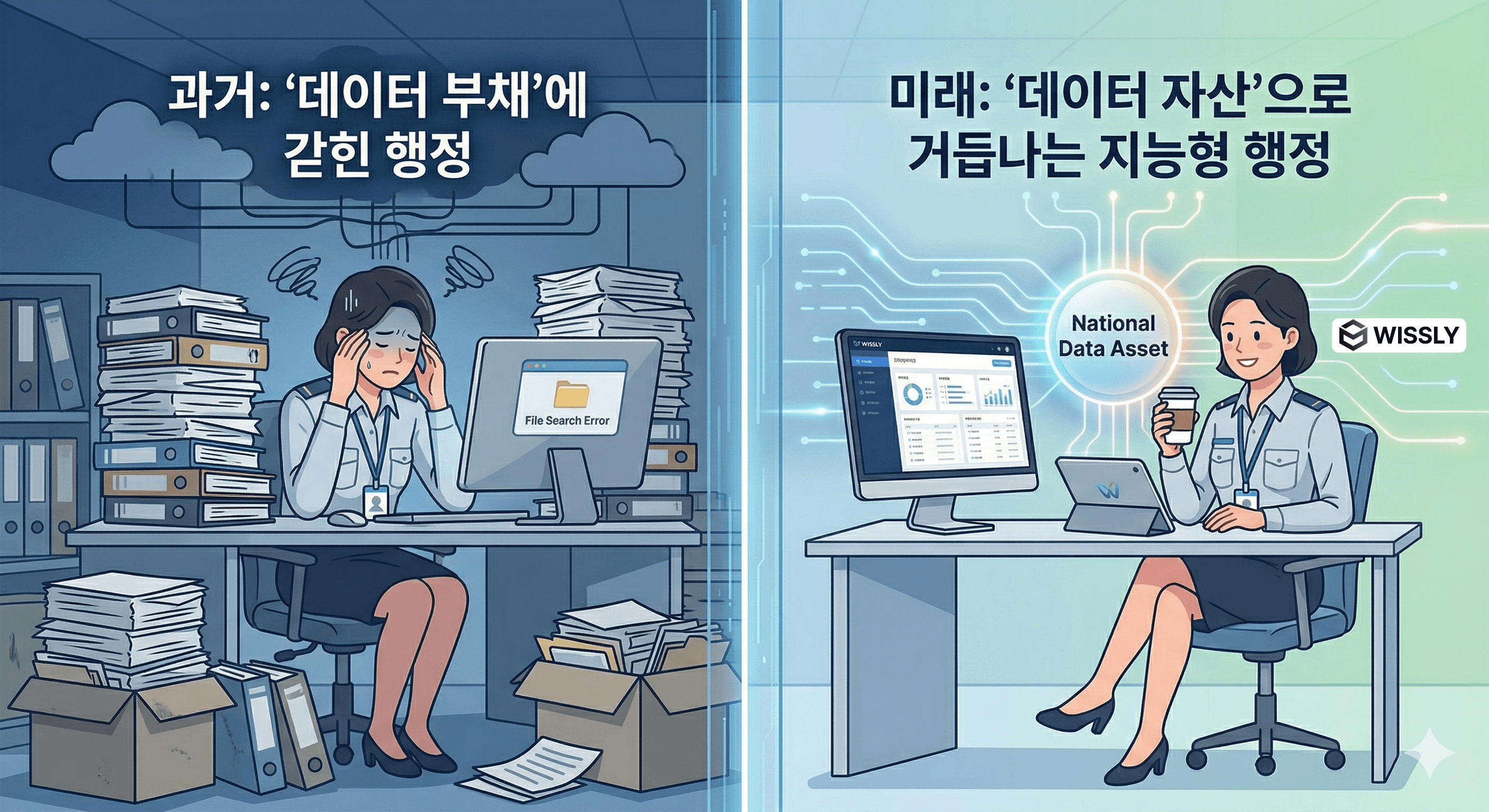 변화: AI가 서류 검토와 법령 대조의 90%를 선제적으로 수행합니다. 공무원은 AI가 정리해온 근거를 바탕으로 최종 '정책적 판단'과 민원인과의 '심도 있는 소통'이라는 본연의 가치에 집중하게 됩니다. '데이터 부채'로 쌓여있던 캐비닛 속 문서들이 비로소 실시간으로 활용되는 '국가 데이터 자산'으로 거듭나는 순간입니다.