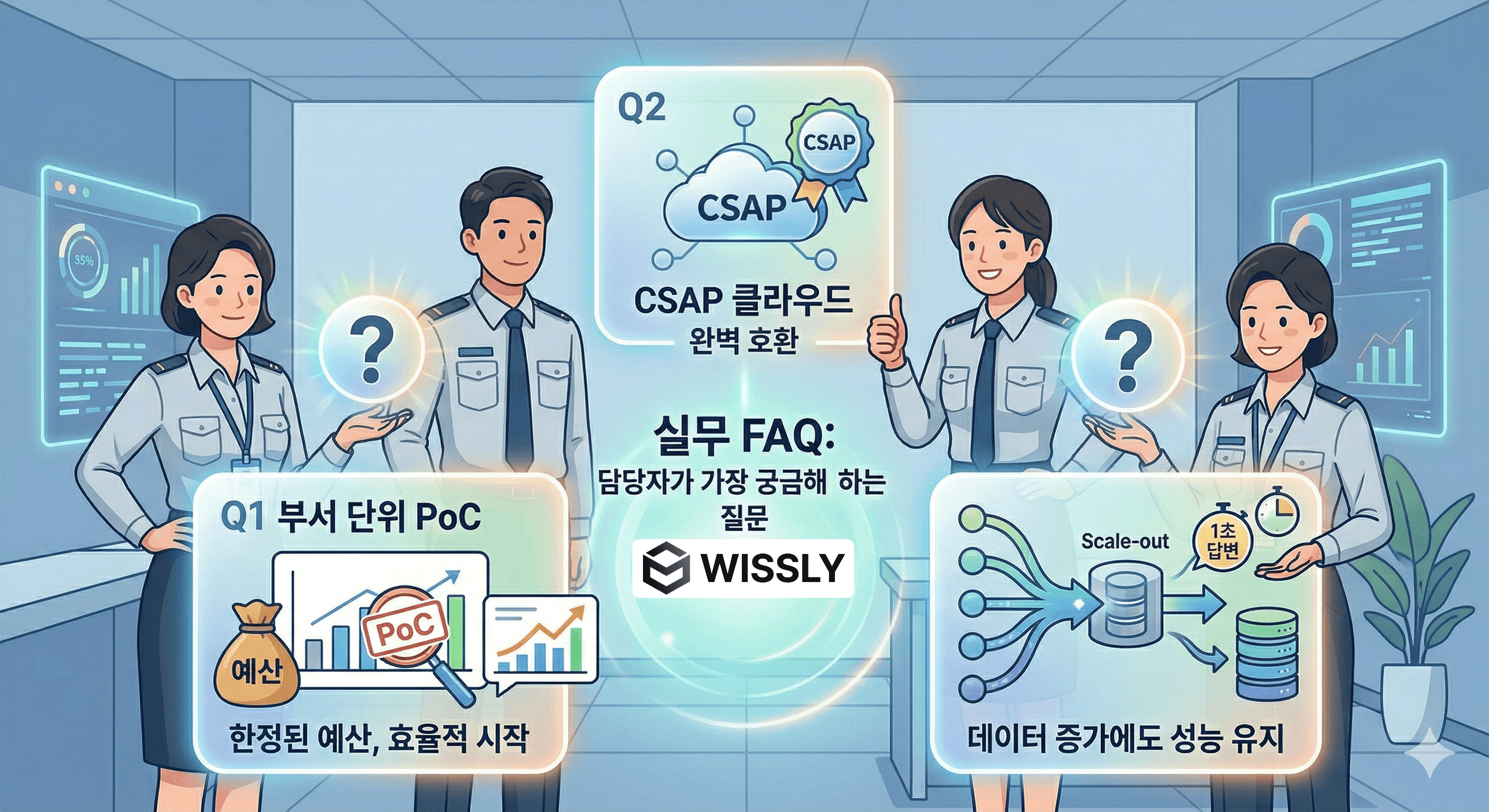 A2. 위슬리의 고성능 엔진은 데이터가 늘어날수록 성능이 저하되는 일반 시스템과 다릅니다. 분산 처리 아키텍처를 지원하므로, 데이터가 수십만 건으로 늘어나도 서버 자원을 유연하게 추가(Scale-out)하여 답변 속도를 몇초 이내로 유지할 수 있습니다.