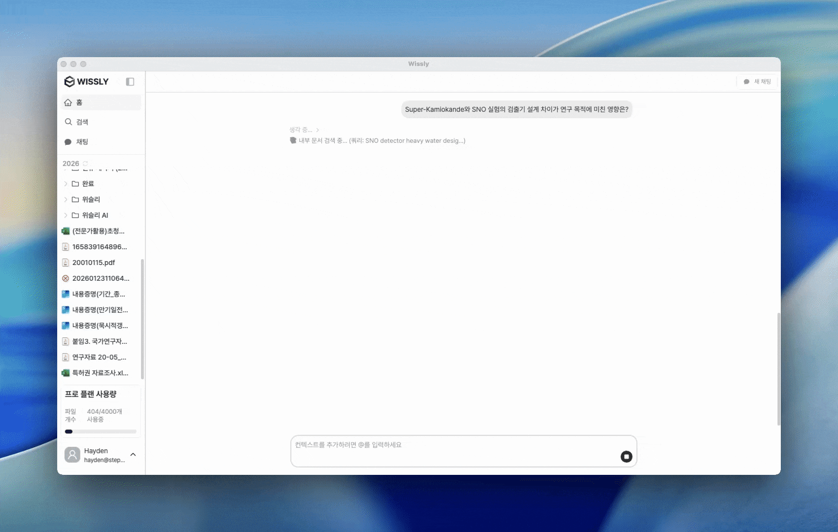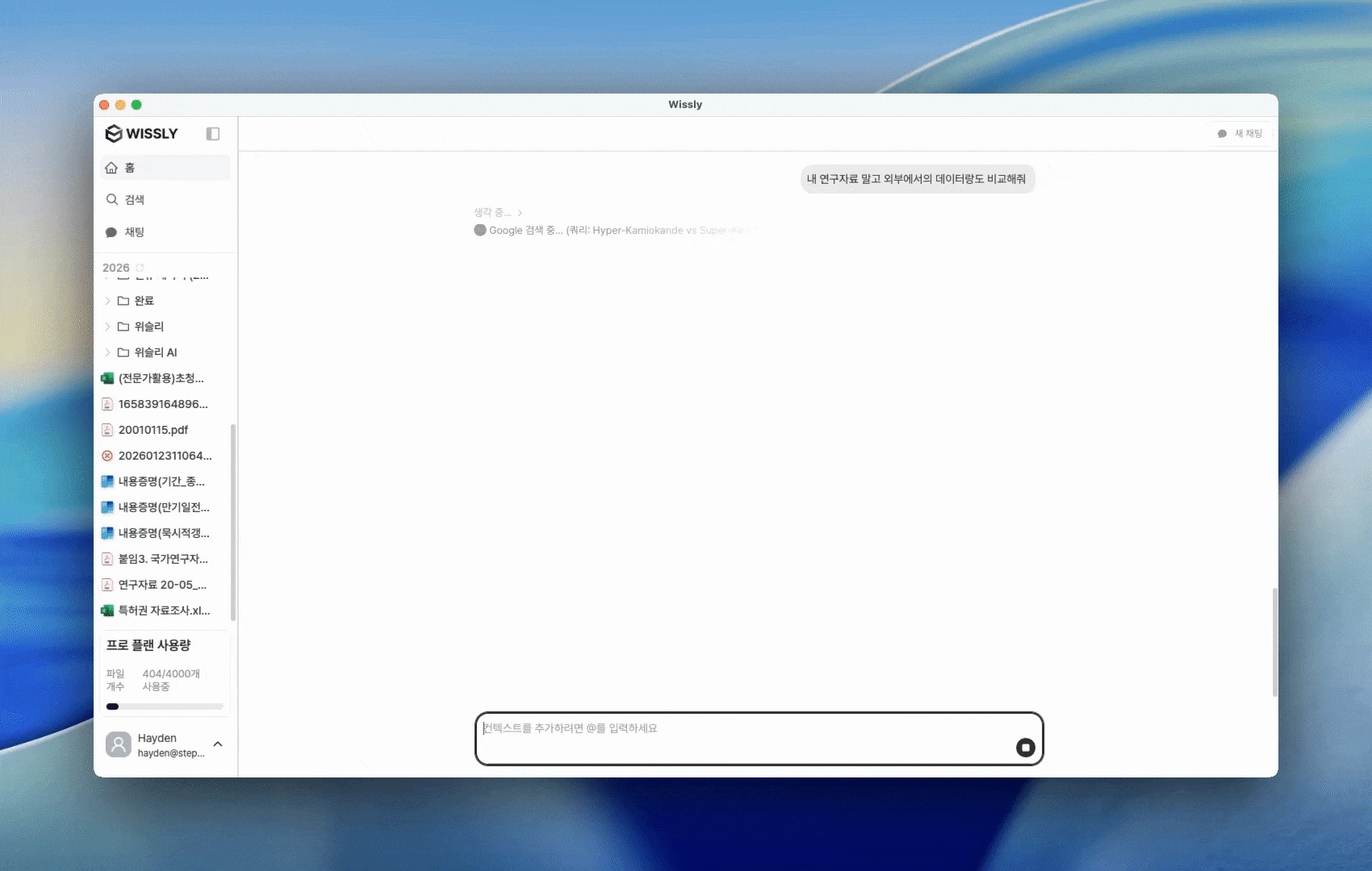 하이브리드 리서치(Hybrid Research): 내 연구실의 미발표 데이터(Internal)와 실시간 학계의 방대한 논문 DB(External)를 동시에 교차 검색합니다. 내 가설을 입력하는 순간, Wissly(위슬리)는 내부 자료와 외부의 최신 연구를 연결해 하나의 완성된 인사이트를 제공합니다.